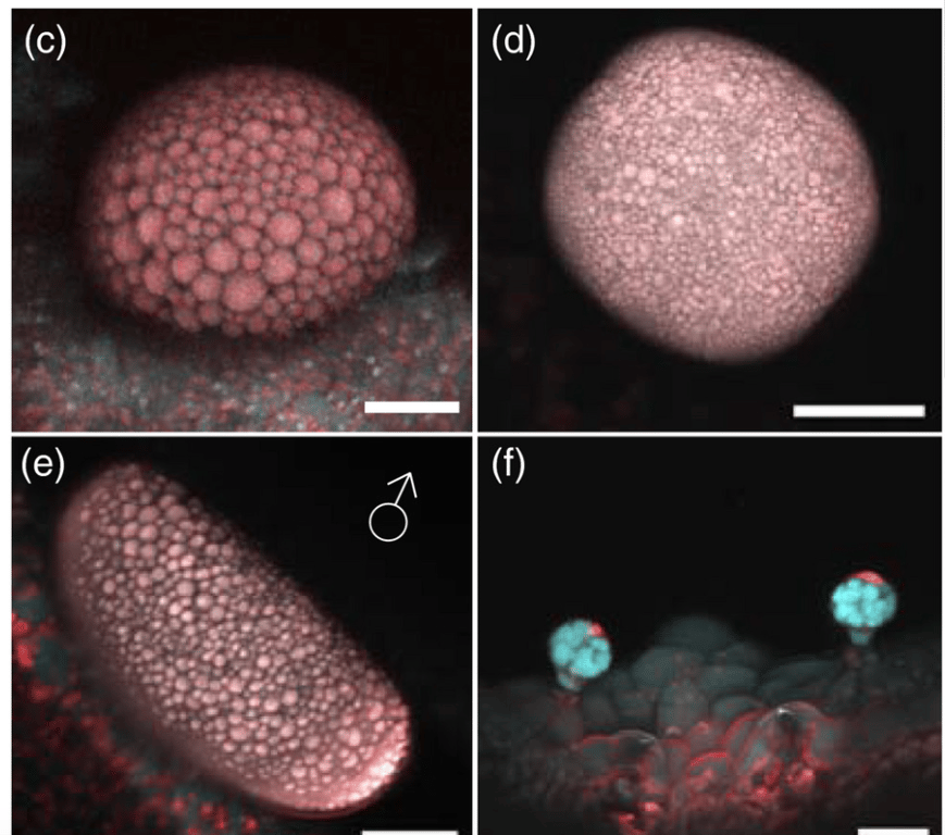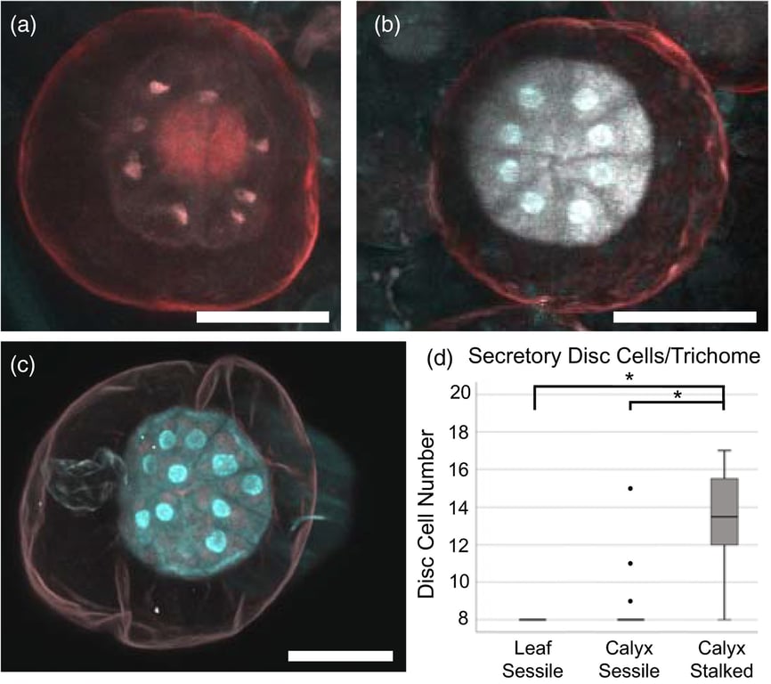 Стеблевидные железистые трихомы на зрелых цветках конопли имеют разделение клеток в секреторном диске. Изображение: Samuels Lab/UBC
