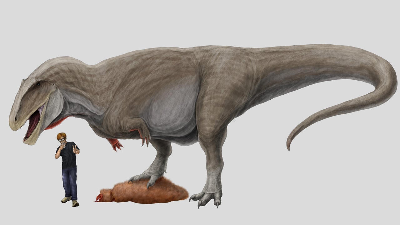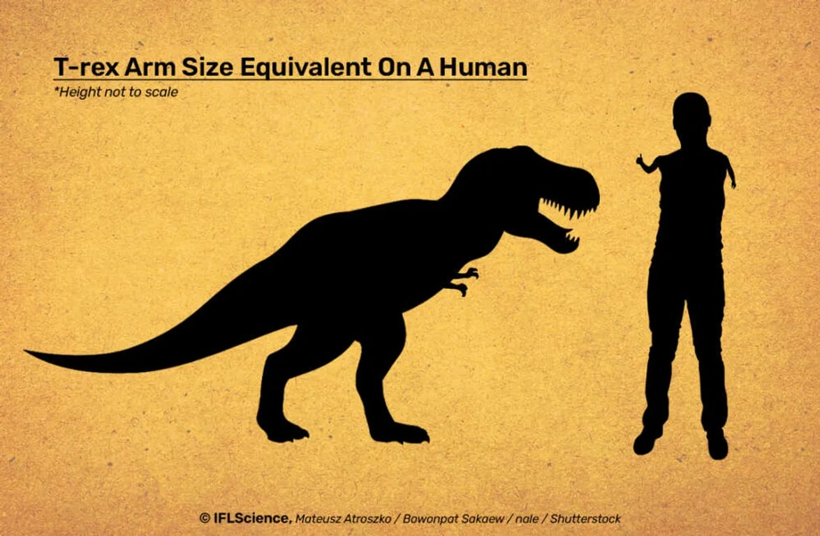 14-метровый Т. рекс имел руки меньше метра. Это эквивалентно человеку ростом 1,8 м с руками длиной всего 13 см. Забавная иллюстрация показывает всю абсурдность.