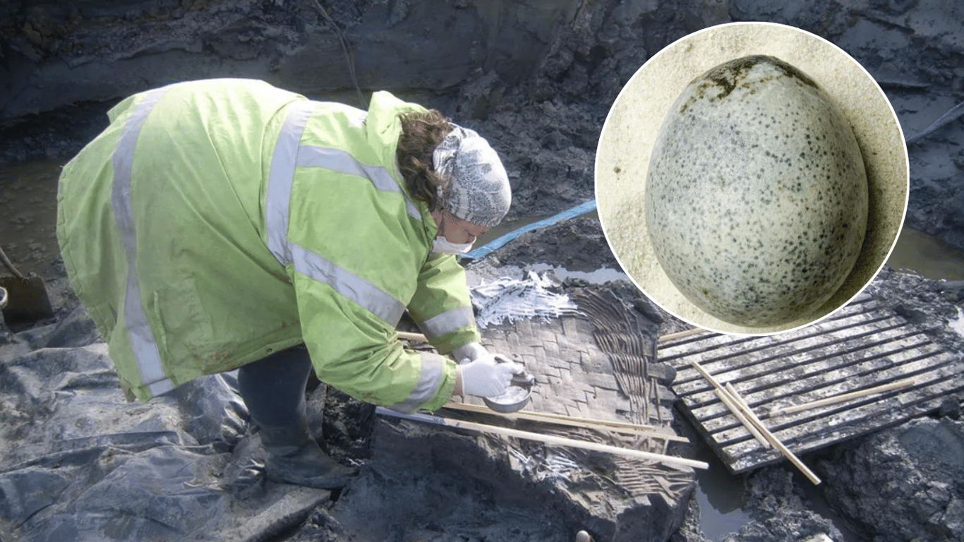 Археолог на місці біля Ейлсбері розкопує унікальне яйце. Колаж Oxford Archaeology